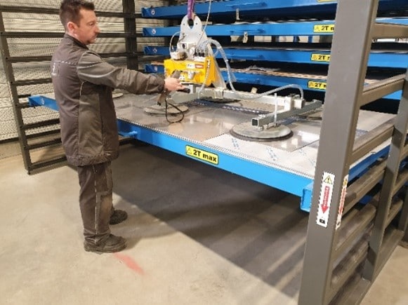 La société a investi dans des ponts roulants, des palonniers à ventouses, des potences de manutention ou encore des racks à tôles afin de supprimer le port de charges manuelles, le tirage des tôles et d’éviter tous les gestes à risque.